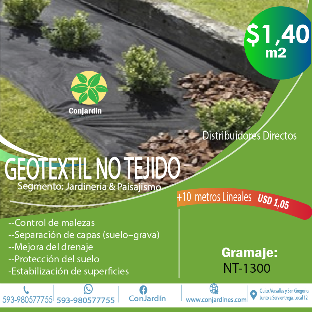Gramaje de 300 gramos se utiliza para drenaje en jardineras. A partir del 10 metros lineales se vende a USD 1,05 . También se vende por rollos.